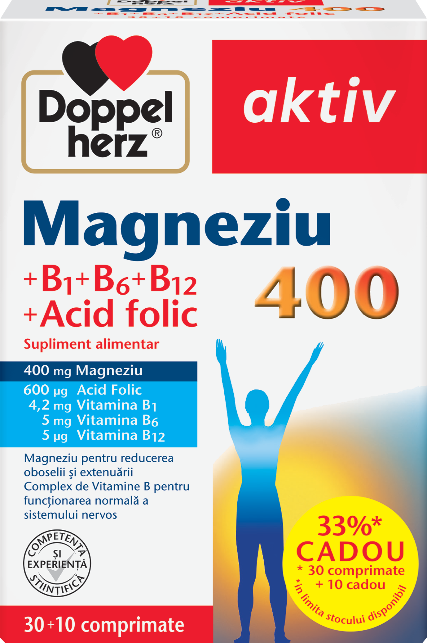 Ingrediente: Oxid de magneziu, celuloza microcristalina si croscarmeloza sodica (agenti de incarcare), dioxid de siliciu (agent antiaglomerant), celuloza pulbere (agent de incarcare), hidroxipropilmetilceluloza (agent de glazurare), ulei de palmier hidrogenat, talc (agent antiaglomerant), dioxid de titan (colorant), saruri de calciu ale acizilor grasi (agent antiaglomerant), selac (agent de glazurare), clorhidrat de piridoxina (Vitamina B6), mono- si digliceride ale acizilor grasi (emulsifiant), nitrat de tiamina (Vitamina B1), ciancobalamina (Vitamina B12), ulei de masline, polisorbat 80 (emulsifiant), acid pteroilmonoglutamic (acid folic).