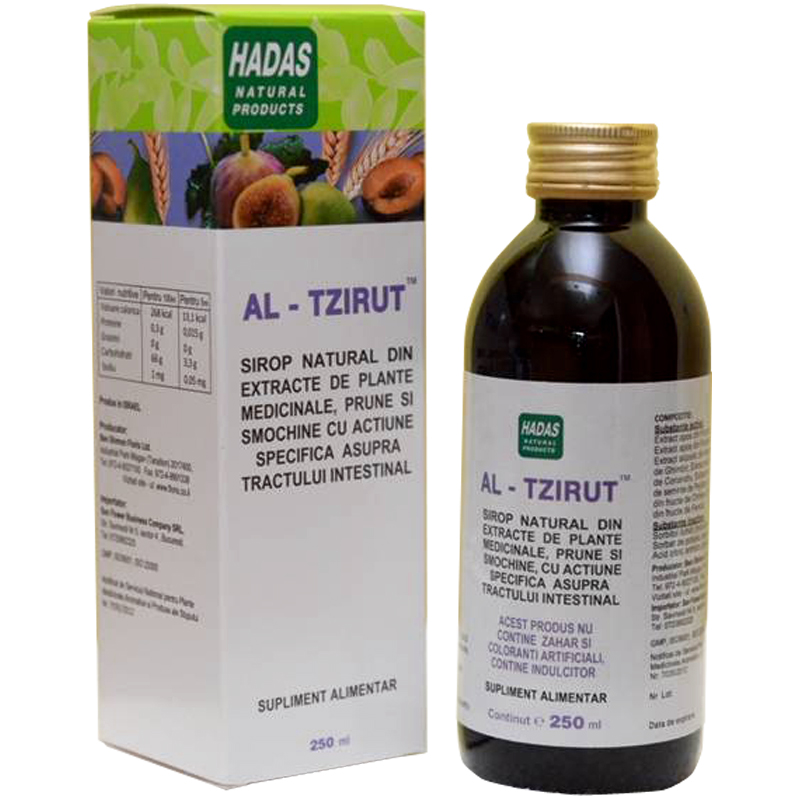 Siropul Al-Tzirut de la Floris-Hadas este un produs laxativ ideal in tratarea naturala a constipatiei. Siropul Al-Tzirut se bazeaza pe beneficiile unor extracte concentrate de prune uscate si smochine, sirop de sorbitol precum si plante medicinale: psyllium, fenicul, chimen, ghimbir si coriandru, care au capacitatea de a atenua flatulenta si durerile de stomac.