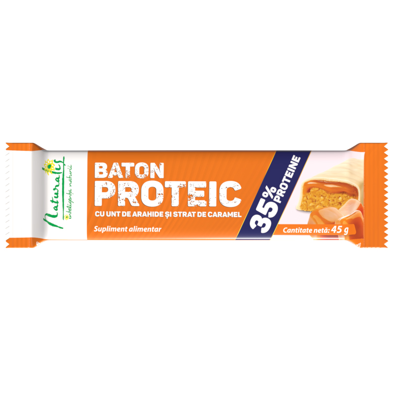 Batonul proteic Naturalis cu aroma intensa de unt de arahide si strat fin de caramel combina gustul placut cu un aport ridicat de proteine si 9 vitamine. Formulat pentru persoanele active, acesta sustine masa musculara, refacerea dupa efort si furnizeaza energie rapida atunci cand programul este solicitant sau antrenamentele sunt intense. Textura sa il face usor de consumat oriunde, fiind o gustare functionala si satioasa.