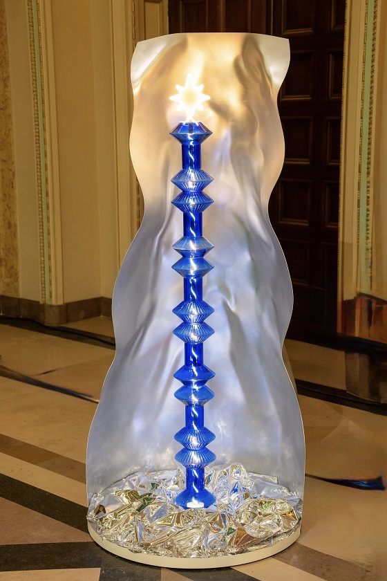 „Voltaquin” este un brad arhitectural, sculptural, construit din alama lustruita, elemente de sticla si componente 3D printate, care transforma lumina intr-un spectacol fascinant.