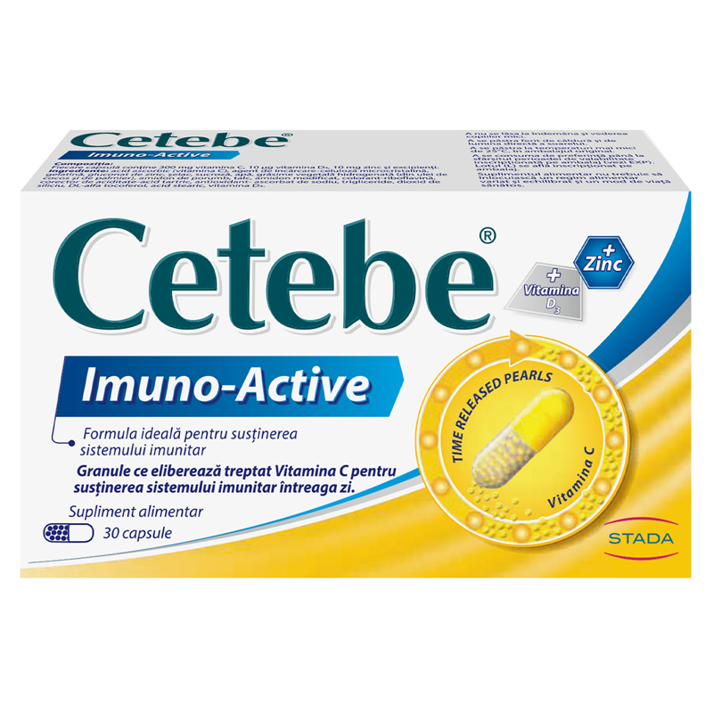 Cetebe Imuno-Active contribuie la functionarea normala a sistemului imunitar. Organismul uman nu este capabil sa stocheze Vitamina C mai mult de cateva ore, insa Cetebe Imuno-Active este creat special pentru a asigura concentratii constante de Vitamina C in sange si tesuturi pe parcursul a 8 ore, deoarece capsula contine granule cu eliberare prelungita, care elibereaza treptat Vitamina C pentru sustinerea sistemului imunitar intreaga zi.