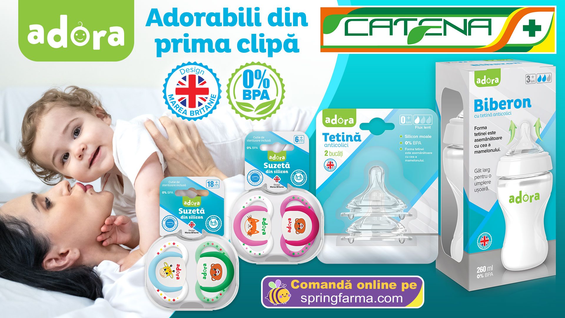Grija si atentia la detalii sunt valori esentiale pentru brandul Adora, ce se reflecta in fiecare produs realizat. Fie ca este vorba despre accesorii pentru hranire si alaptare sau dispozitive care simplifica ingrijirea – toate au fost gandite sa fie de ajutor in etapele-cheie de crestere si dezvoltare ale bebelusilor. Gama Adora cuprinde biberoane si tetine anticolici, suzete, pompa manuala pentru san, dispozitiv pentru hranirea bebelusilor, jucarii umplute cu apa pentru dentitie, tampoane pentru san, protectoare pentru mamelon, sterilizator electric pentru biberoane, pungi pentru stocarea laptelui matern, lantisoare pentru suzeta.