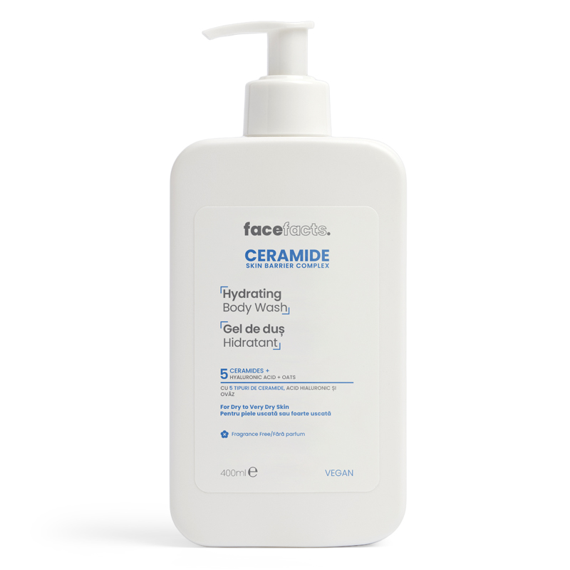 Gelul de dus Face Facts Ceramide curata delicat pielea, mentinand hidratarea si confortul acesteia. Ideal pentru utilizarea zilnica, ofera o senzatie de prospetime si catifelare.