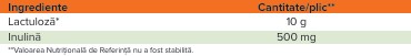 Ingrediente: lactuloza (solutie minimum 62%); solvent: apa; inulina din radacina de cicoare (Cichorium intybus L.); acidifiant: acid malic; conservant: sorbat de potasiu; potentiator de aroma: aroma naturala de lamaie.