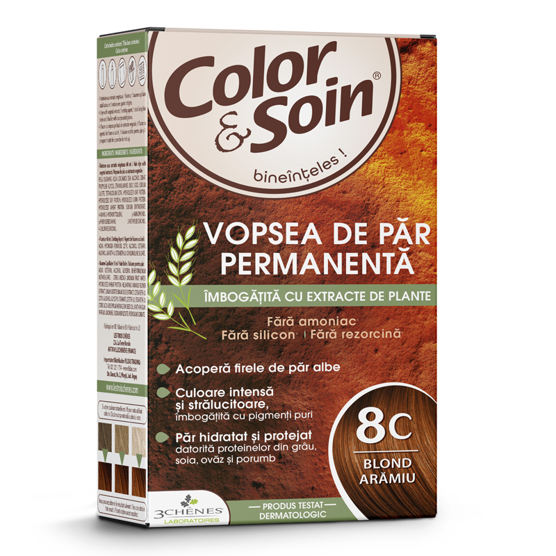 Pentru un par stralucitor, pentru o culoare puternica de blond-aramiu, de lunga durata, alege vopseaua de par de la Color & Soin, nuanta blond cuivre 8 C. Vopseaua are o formula ce nu irita pielea, hraneste firul de par, pretuind sanatatea si naturaletea acestuia. Firele albe de par vor fi foarte bine acoperite, iar complexul vegetal transforma vopsitul intr-o placere. Parul va avea un miros placut, iar culoarea se va mentine o perioada lunga de timp.